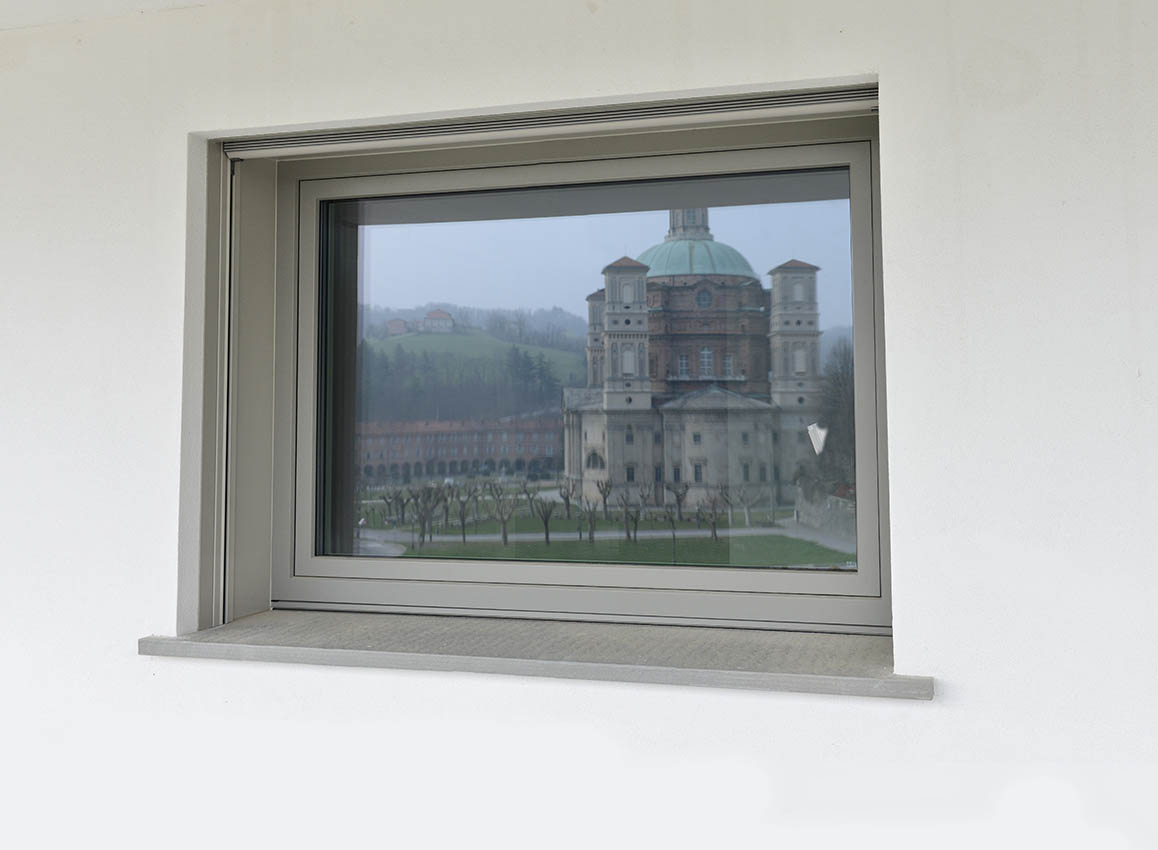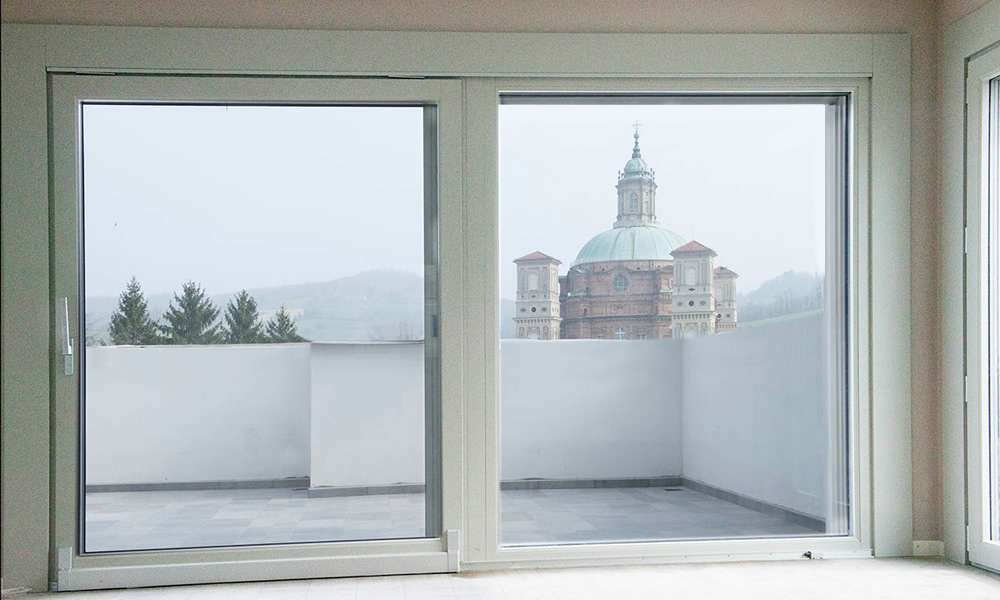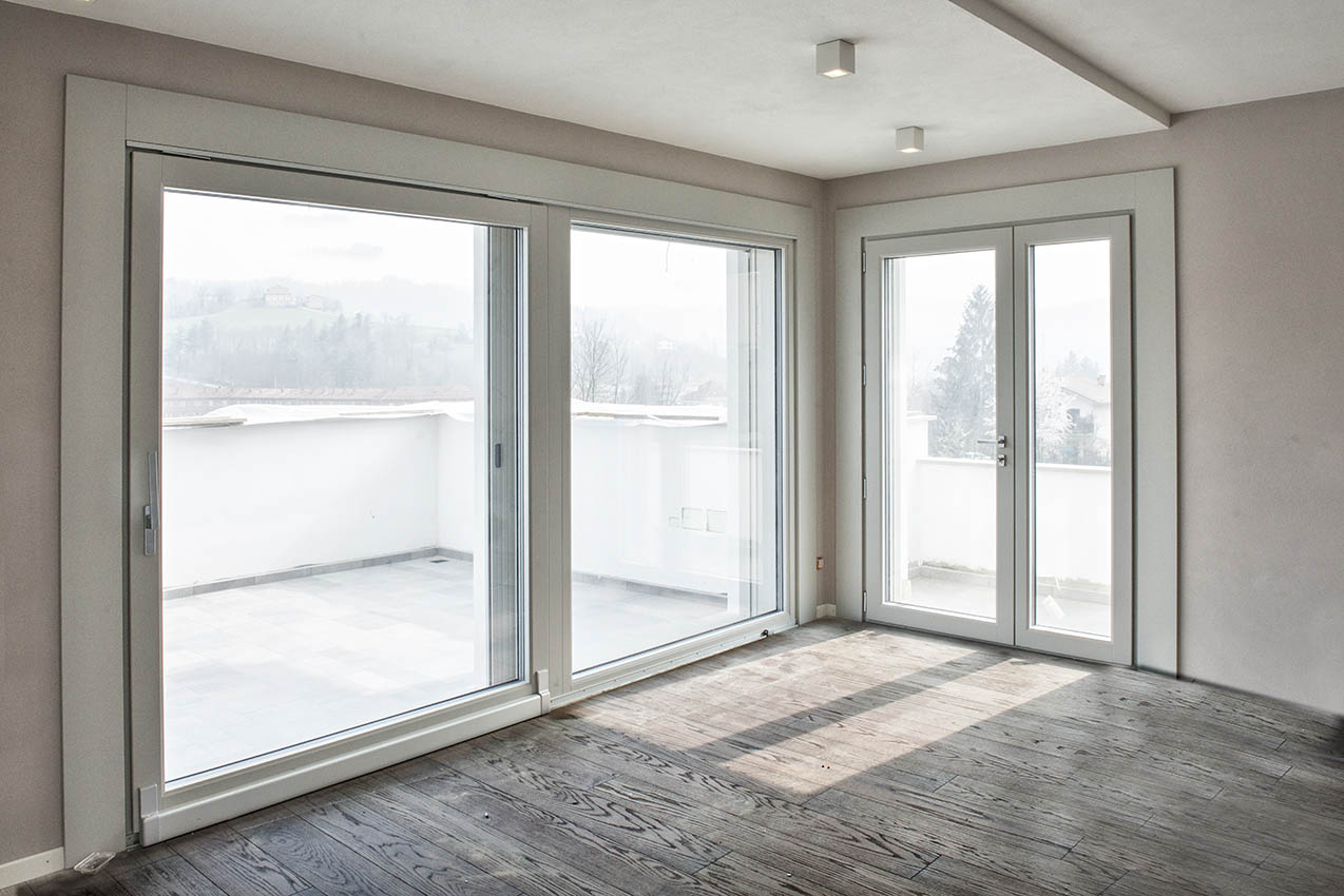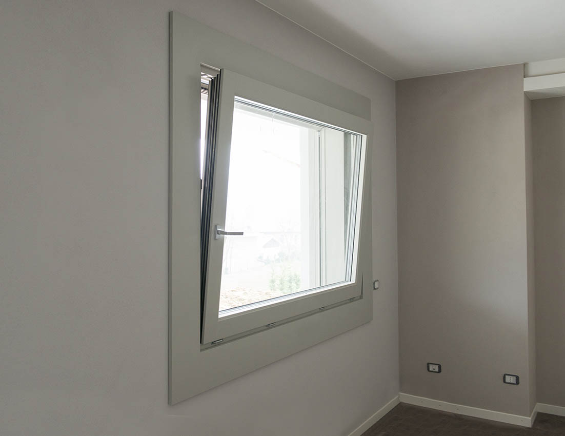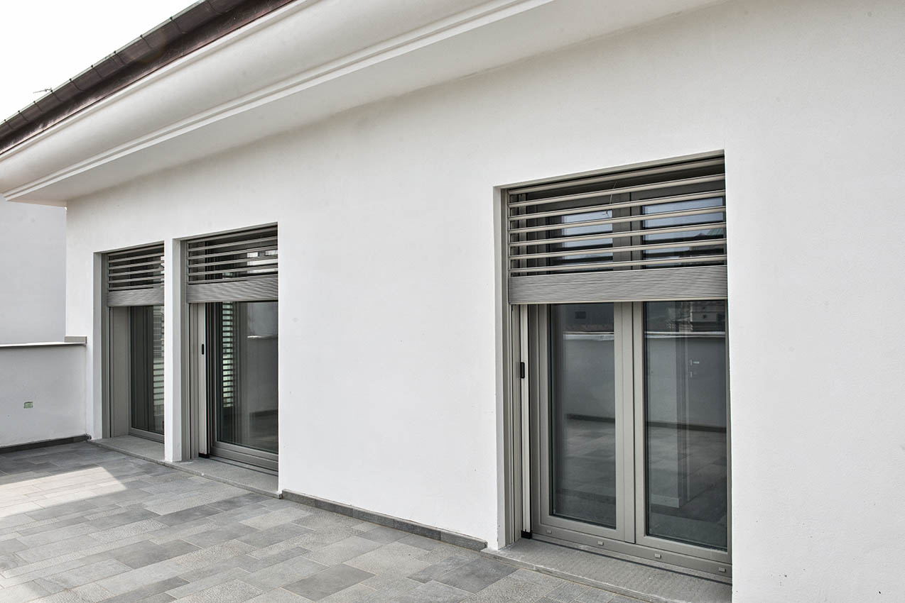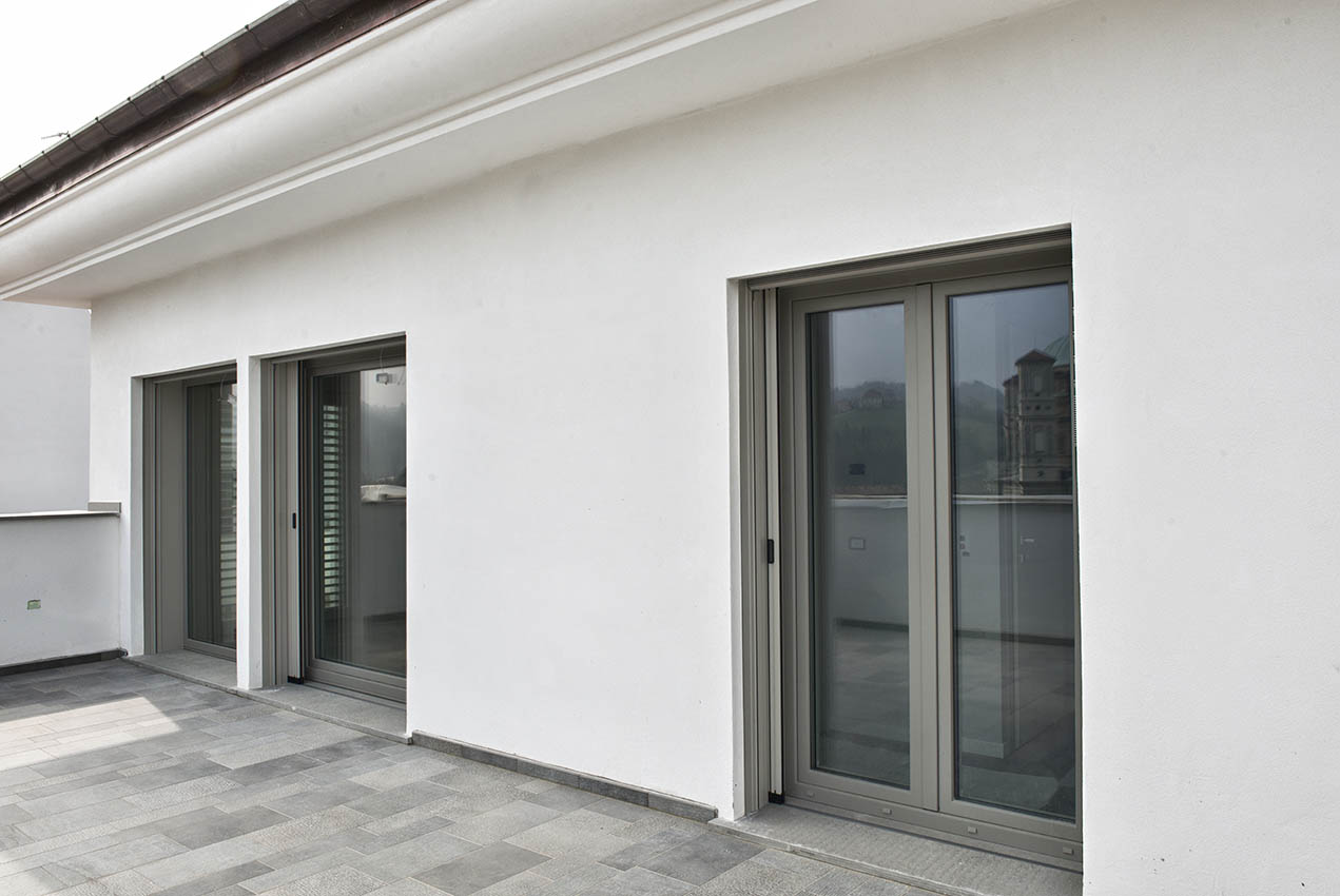 Gli infissi, realizzati in legno alluminio passivo, con vetro triplo e copertina in XPS, sono stati inseriti in un falso telaio appositamente costruito, in abbinamento a frangisole motorizzati e zanzariere in tinta. Il risultato è un’unione di modernità, luminosità, bellezza e risparmio che non ha eguali.